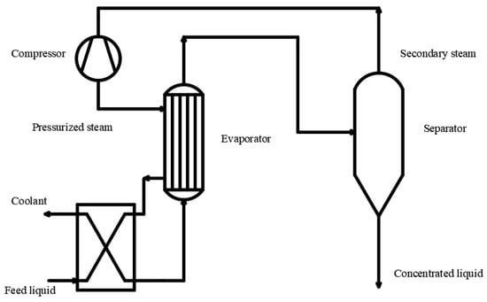 The mechanical vapor recompression system (MVR) uses a vapor compressor to process secondary vapor to increase the pressure and temperature of the secondary vapor, and the heated vapor can be reused as a heat source for evaporation [33]. MVR can realize the recovery and use of inferior waste heat in the evaporation process and reduce the need for external energy. Compared to MED, the energy consumption is greatly reduced. MVR technology has attracted more and more attention and has been studied in the field of industrial wastewater reuse due to its low energy consumption, compact structure, and high thermal energy efficiency. Qu et al. [34] carried out a pilot-scale experimental study on simulated saline wastewater (EC = 5.27 × 104 μs·cm−1, TDS = 3.46 × 104 mg·L−1). The results showed that the reuse rate of system water reached 85.10%, the desalination rate reached 99.66%, and the concentration multiple reached 6.20. At present, the main shortcomings of MVR technology are that the investment cost is high and scaling easily occurs due to the precipitation of salt in the desalination process. Figure 3 shows the MVR process flow.