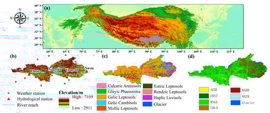 (a) Location; (b) topography, weather stations, and hydrological stations; (c) land-use map; and (d) soil-type map of the midstream section of the Yarlung Tsangpo River.