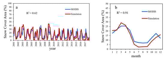 Simulated and observed (MODIS) for (a) monthly and (b) multi-year monthly average snow cover area of the study area during 2001–2017.