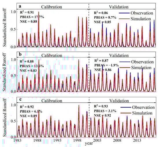 Comparison between simulated and observed monthly runoff of (a) Nugesha station; (b) Yangcun station; and (c) Nuxia station during calibration and validation periods.