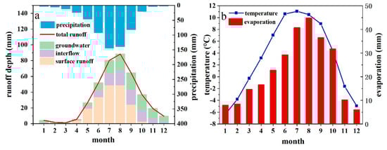 Temporal variation in (a) the monthly precipitation and total runoff and runoff component; and (b) temperature and evaporation.