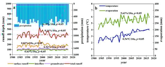 The temporal variations in the annual precipitation, annual total runoff, and annual runoff components are presented in Figure 5a. Annual precipitation showed an increasing trend at the rate of 0.19%/10 yr (p > 0.05), and annual total runoff depth showed an increasing trend at the rate of 0.16%/10 yr (p > 0.05). Annual surface runoff depth showed an increasing trend at the rate of 0.03%/10 yr, (p > 0.05), annual interflow depth showed an increasing trend at the rate of 0.83%/10 yr (p > 0.05), and annual groundwater depth showed an increasing trend at the rate of 0.52%/10 yr (p > 0.05). Figure 5b shows the temporal variations in annual temperature and evaporation. The annual temperature showed an increasing trend at the rate of 0.54 °C/10 yr (p < 0.05), and the annual evaporation showed an increasing trend at the rate of 5.63%/10 yr (p < 0.05). This also indicated that the total runoff as well as the runoff components in the study area showed an increasing annual trend that was mainly influenced by precipitation. Evaporation was significantly positively correlated with both temperature and precipitation (p < 0.05), because evaporation from the watershed was controlled by both atmospheric moisture supply to the land surface and energy supply conditions [,,,].
