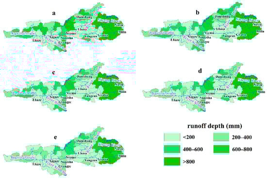 Spatial variation in total runoff depth in (a) especially high flow years; (b) high flow years; (c) normal flow years; (d) low flow years; and (e) especially high flow years.