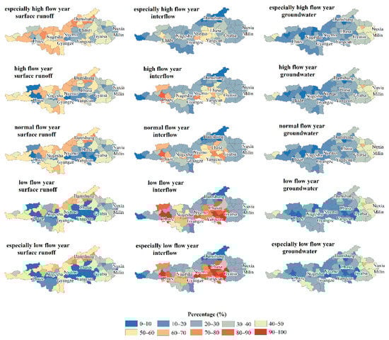 Figure 7 shows the spatial distribution of the runoff component. The spatial distribution of surface runoff, interflow, and groundwater in the area near Damxung was similar, and the proportion of surface runoff was basically around 50% in five representative years. The soil-type map of the study area (Figure 1) indicates that Gelic Leptosols, which have low permeability, are widespread in the area near Dangxiong, so precipitation does not readily infiltrate the soil to form interflow and groundwater; rather, it easily collects on the surface to form surface runoff. Even in especially low flow years when precipitation is relatively low, a large amount of precipitation still collects on the surface because of the low permeability.
