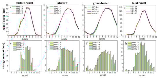 Monthly (a) surface runoff depth; (b) interflow depth; (c) groundwater depth; and (d) total runoff depth for 2020–2100. Monthly (e) surface runoff depth variation; (f) interflow depth variation; (g) groundwater depth variation; and (h) total runoff depth compared to the baseline period of 1983–2017 in the study area under the four scenarios.