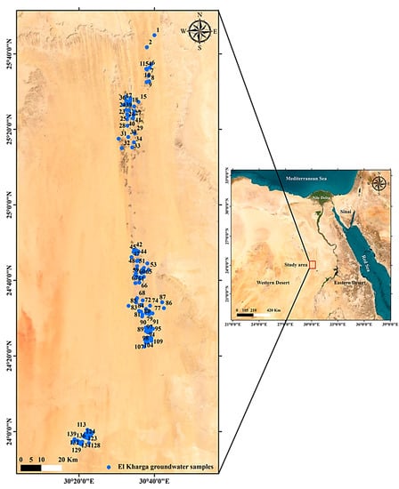 This study chose the dry land area of El Kharga Oasis to verify the interactions of the hydrogeochemical condition and agriculture systems on the hydrochemical change of the GW. The research area is situated between the longitudes 30°10′ and 30°48′ E and latitudes 24°0′ and 25°48′ N (Table S1). The production wells were established for sustainable agriculture and drinkable water use. Upper Cretaceous sediments (the Quseir Formation) underpin a large portion of the study region, particularly in the east, while only the northeast has outcrops of Tertiary deposits (marly and chalky limestones). Quaternary formations (sand dunes and sabkha sediments) with thicknesses ranging from 2 to 10 m are found in the western part of the region. Furthermore, Precambrian basement rocks (granites) are exposed in the southeast part of the study area.