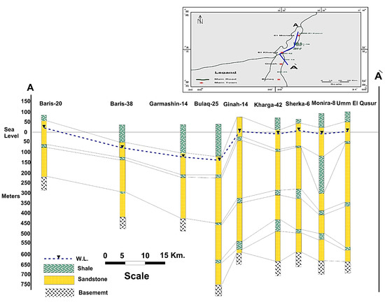 In the study region, the regional direction of the GW flow is a northerly to northeasterly direction (Figure 2). Furthermore, several GW flow directions were recorded. The GW flow direction in the northern part of the study region comes from the southwest to east direction, while from the west to east direction in the central region. Another local GW flow direction from south to northeast was observed in the southern part of the studied area. Large decreases in the GW heads were recorded in some areas due to the effect of over pumping and rapid drawdown. The study area’s severe hydraulic gradients are most likely caused by the region’s high GW abstraction rates, the Nubian aquifer’s comparatively thin saturation thickness, and the sediments’ low hydraulic conductivity [53,54]. The GW is an under unconfined condition in the Baris Oasis and south area of NAS, while it is an under confined system in El Kharga Oasis (Figure 2). Therefore, the potentiality of the northern parts is less than the northern parts. Excessive GW utilization in these areas might result in significant reductions in the aquifer potentiometric head and the water quality deteriorating. The correlation between the different stratigraphic logs from north to south across El Kharga Oasis showed that the NSSA is located above basement rocks and overly by shale layer. The aquifer thickness increases gradually from the north to south direction of the study area. The NSSA is divided to several layers separated from each other by thin layer of shale, which could be connected through the fault plain (Figure 2).