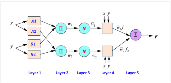 Figure 5 illustrates the ANFIS model, which has an incoherent x and y input network and a multilayer feed-forward architecture. The rule foundation for the Sugeno model (Figure 4) is as follows: