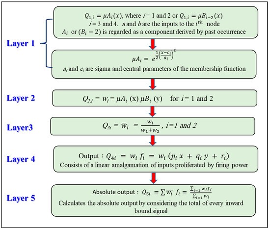 where A and B are the memberships orders of magnitude, a and b indicate indirect identifying function. p, q, and r are relevant constraints modified in the training algorithm’s forward pass, and fi is the output falling inside the inconsistent region determined by the FIS concept. Figure 5 illustrates the five layers that comprise ANFIS where the memberships function of the fuzzy set A and B are and , respectively. Further information regarding ANFIS is provided in Khadr [63].