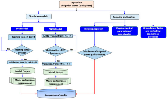 The major objectives of this work were to (i) define the GW chemistry, GW categories, and their geochemical controlling processes employing physicochemical metrics and imitative techniques; (ii) evaluate the GW’s appropriateness for agricultural purposes utilizing various IWQIs; (iii) investigate the performance of ANFIS and SVM models in the reliable prediction of IWQIs, such as IWQI, SAR, SSP, KI, PS, and RSC.