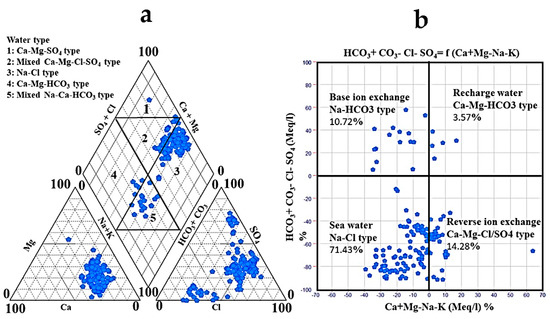 For the categorization of the GW hydrochemical facies, a piper plot was established (Figure 7a) [65]. The cationic triangle showed that approximately 82.14% of the total water samples were Na+ and K+ dominant, while approximately 17.14% were nondominant, and the rest of samples were Mg2+ dominant. The water samples were divided into five hydrochemical facies based on the presentation of the pipe plot (Figure 7a). One sample fell within the Ca-Mg-SO4 facies zone (Type 1) with permanent hardness. Approximately 88 samples belonged to the Na-Cl facies (type 2), while five samples belong to the Ca-Mg-HCO3 facies zone (Type 3), and 15 samples belonged to the mixed Na-Ca-HCO3 facies zone (Type 4). The rest were in the mixed Ca-Mg-Cl-SO4 zone (type 5). The majority of the selected samples revealed that the salinity indices (SO42− + Cl−) were generally higher than the alkalinity (HCO3− + CO32−), and the alkalis (Na+ + K+) were higher than the alkaline earths (Ca2+ + Mg2+), as the overarching factor dictating the NSSA’s hydrochemistry in this region.