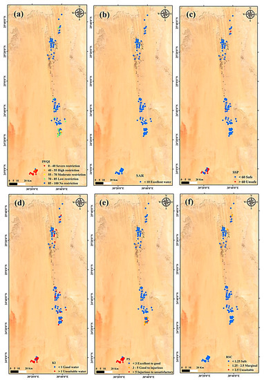 Spatial distribution maps of the IWQIs in the study area: (a) IWQI, (b) SAR, (c) SSP, (d) KI, (e) PS, and (f) RSC.