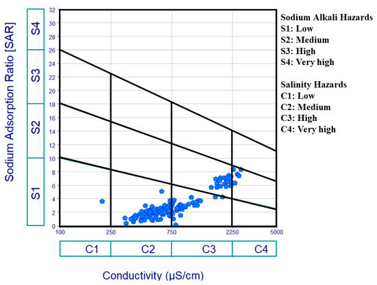 In irrigation water, the term “SAR parameter” refers to the soil matrix’s capability to release Ca2+ and Mg2+ and absorb Na+ ions at the locations of ion exchange, which spreads soil particles and reduces infiltration capacities [85,86]. Highly saline water can be beneficial for the soil structure by accelerating infiltration, but it puts plants under higher water stress to draw water from the soil in the case that the irrigation water has a high salinity, and plants and crops must expend more energy (water stress condition). The USSL diagram categorizes and demonstrates the relation between SAR and EC (Figure 11) [54]. Most of the samples fell between C2-S1 and C3-S1 (low SAR and medium to high salinity), 20 samples belonged to C3-S2 class (high salinity and medium SAR), 5 samples of NSSA fell in the C4-S2 class (very high salinity and medium SAR), and only 1 sample was in the C1-S1 class (low salinity and low SAR). The maximum value of SAR, for all of the investigated samples, was less than 10, indicating an excellent class for irrigation (Figure 10b).