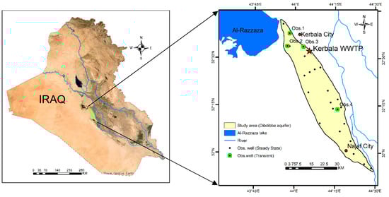 Figure 1 locates the study area in the middle of Iraq, between the cities of Karbala and Najaf. It is between latitudes 31°55′ and 32°45′ and longitudes 43°30′ and 44°30′. The Dibdibba aquifer is a shallow, unconfined groundwater aquifer with a homogeneous soil profile and is entirely recharged by rainfall. It has an area of 1100 km2 and is surrounded by two ledges: Tar Al-Sayyed, which is inside the city limits of Kerbala, and Tar Al-Najaf, which is inside the city limits of Najaf province. The northern limit of the aquifer is close to Al-Razaza Lake, which is an open-surface reservoir. Quaternary sediments define the aquifer’s eastern boundary. The topography shows elevations between 10 and 90 m above sea level. The primary direction of the flow of groundwater is typically from southwest to northeast, with hydrologic gradients varying between 0.0011 and 0.0005. The average temperature varies from 11 °C in winter to 37.6 °C in summer. The average rainfall varies between 90 mm, as recorded at the weather station in Karbala, and 112 mm at the weather station in Najaf. In addition, 80% of annual precipitation falls between November and March, which are the wettest months of the year. In this aquifer, water levels have dropped significantly since 2003, negatively impacting the quality of the available water. The withdrawal of water through overexploitation has also had a significant impact. According to previous research [,], salinization of groundwater is an indication of increased irrigation water use in agriculture, which also results in land degradation and the movement of pollutants to unconfined aquifers. More details about the area were given in a previous paper [].