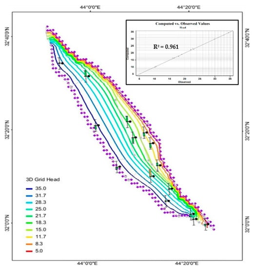 The steady state calibration of the flow model allowed for the estimation of natural groundwater recharge varying from 9 to 12 percent of the mean annual precipitation for the Dibdibba aquifer. These ratios were similar to those employed in earlier research [,]. For the steady state, the results of the calibrated model were acceptable and matched the observed data with projected groundwater table, and the determination coefficient (R2) was around 0.96 (Figure 3). Figure 3 illustrates the calibration results of the model with observation ground water levels in the selected wells. A scatter diagram of these results was plotted and is shown in Figure 3. The observed value is shown by the center line. The whiskers on the top and bottom edges represent the measured data plus the period and the measured values minus the period, respectively. The full line displays the error, where a green line signifies that the error is contained inside the designated range (lower than 0.5 m). Red lines indicate errors greater than 1 m, while yellow bars indicate errors between 0.5 and 1 m. The Parameter ESTimation (PEST) tool within the GMS software was used to obtain the optimal solution mode compatible with the minimum errors during the calibration process. Groundwater levels from 15 wells were used for the numerical model calibration and validation under steady-state conditions. These wells were selected in order to cover the entire research area and reduce the length of the simulation run during the calibration period. In order to achieve an acceptable degree of accuracy, 15 calibrating targets were used to simulate levels of water in the models; 14 of the lines were green (error below 0.5 m), but one line was yellow (error over 0.5 but lower than 1.0 m). During the conceptual model’s calibration procedure, the research area was separated into a number of zones by hydraulic conductivity and expected natural recharge rates.