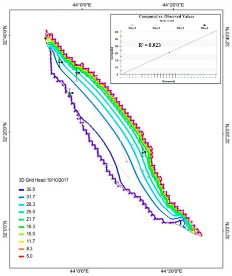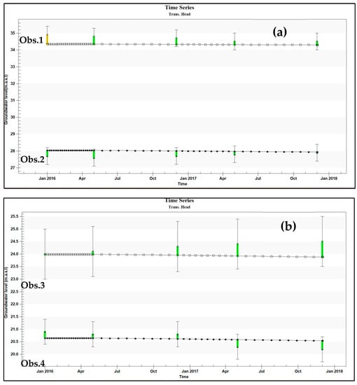 In order to investigate the validity of the numerical model results for the future time period, the transient numerical model results were examined with historically observed groundwater levels from four monitoring wells during the period 2016–2017. Building a transient simulation mode requires the handling of a huge quantity of transitory information from various sources, such as data on the depth of water in observation wells and on recharging and pumping wells. The transient state was simulated by initiating a simulated steady-state groundwater table. The aim of this operation was to measure the groundwater table. The Dibdibba unconfined aquifer’s specific yield (Sy-value) was determined using transient models as preliminary projections. Previous studies’ pumping experiments gave Sy values ranging from 0.001 to 0.05 []. According to the agricultural needs in the research region, different monthly pumping rates were used. Designing a transient model requires careful consideration of the simulation time step used, because this has a significant impact on the results of the numerical model []. The time period was split into 20 time periods and four control wells, with a start time of 1 January 2016, and an end time of 1 December 2017. The selected wells were close to the Karbala treatment plant, especially Obs1 and Obs3 (Figure 1). Specific yield factors were chosen to serve as the simulated results in the PEST operations during the calibration of the transient state. This parameter varied continuously, until a satisfactorily acceptable difference between the measured and simulated water depth was obtained from January 2016 to December 2017. The four calibration objectives in this model are indicated by the color green (Figure 4). The transient numerical model was also examined using a transient scatter plot, which compared the groundwater levels against the simulations. These comparisons are displayed in Figure 4, and the models accurately predicted the measured levels with a determination coefficient (R2) of 0.923.