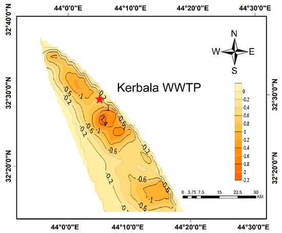 In this study, three different simulation scenarios (SIM1, SIM2, and SIM3) were applied to the prediction period 2016–2030. SIM1 used the same initial conditions, making the assumption that the existing recharge and extraction rates would stay the same as during 2016, excluding the additional rate of artificial recharge from treated water. Based on this first scenario (SIM1), the simulation model projected that the groundwater level would drop by more than 1 m near the Kerbala WWTP location by 2030, and the water quality would become worse. According to this scenario, there would be a loss of more than 2 m of groundwater in the vicinity of the Kerbala WWTP by 2030 (Figure 6). This decline was justified as a result of the excessive use of ground water, the decrease in natural recharge due to the lack of precipitation, and the increased temperatures in the past few years due to climatic changes in the region. Many agricultural areas have suffered in the last few years due to this decline in groundwater levels, which increased withdrawal costs and degraded water quality. Most climate studies have shown that the effects of climate change in the region could become worse at a fairly high rate []. Due to this, it is expected that this drop in water level and quality will have a greater effect on farmers and the region’s ecosystem in the near future.