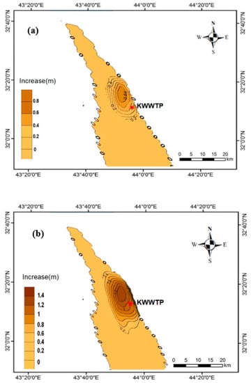In SIM2 and SIM3, the same initial conditions as in SIM1 were implemented, with only the addition of an artificial recharge flow that was pumped into the recharge pond at a rate of 5000 and 10,000 m3/day, respectively. In the simulation model, the recharge pond was represented by one cell. For operational and economic reasons, the site selected for the recharge pond was near the WWTP. When the projected groundwater levels in 2030 for SIM1 and SIM2 were compared, it was found that an increase of up to 0.8 and 1.4 m would be possible with an artificial recharge rate of 5000 and 10,000 m3/day, respectively (Figure 7a,b). Taking into account a minimum rise of 0.2 m, the impacted region around the Kerbala WWTP would be about 78.2 km2 for SIM2 and 110 km2 for SIM3. During the study period, this expected increase would potentially be very important for lowering withdrawal costs and adding more farmland to the region.