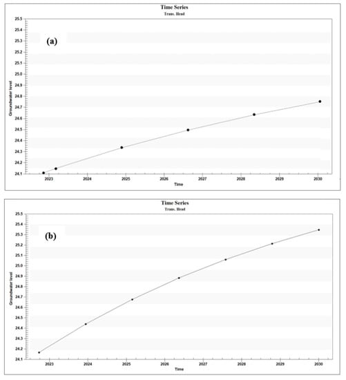 The results related to the monitoring well (Obs.3) situated close to the artificial recharge zone were used to assess the temporal variation of the groundwater elevation, as illustrated in Figure 8. As shown in Figure 8a,b, groundwater levels rose over the eight years of the simulation by 7.5 cm and 12.3 cm each year for the SIM2 and SIM3 artificial recharge modeling scenarios, respectively. It is important to note that the rate of rise differed between the two scenarios because of the different pumping rates of the recharge pond. At the end of the time simulation period (2030), the groundwater table in the observation well (Obs.3) had increased by more than 0.67 m and 1.2 m under SIM2 and SIM3, respectively.