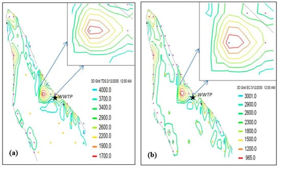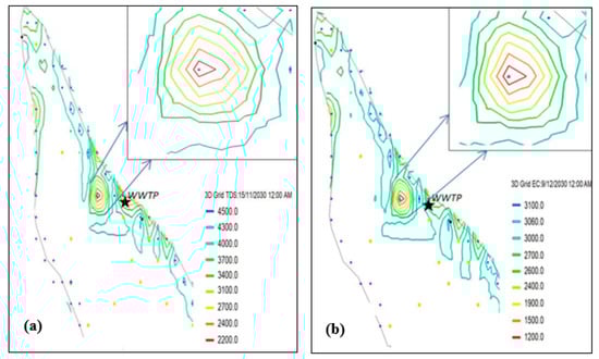 For the third scenario, SIM3, with an increased pumping rate of 10,000 m3/d, as a consequence of this increase, a greater effect was obtained on the quality of groundwater (Figure 10). In fact, the reclaimed area was increased to 62.7 km2 with a TDS of 2600 ppm, and the maximum reduction in TDS reached 1900 ppm near the pond (Figure 10a). For the EC, the region influenced was t increased to almost 77.4 km2 with an EC of 1800 µ.S/cm and a maximum reduction of 1200 µ.S/cm near the recharge pond, as illustrate in Figure 10b.