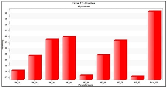 Sensitivity analysis is the method used to quantify the degree of uncertainty in a calibrated model as a result of unknown aquifer characteristics. The aim of sensitivity analysis was to comprehend how different model variables and hydrogeological stressors affect the aquifer and to identify the parameters which were most sensitive, thereby requiring special attention in future investigations. At the conclusion of the PEST iteration, sensitivity analyses for each of the parameters were carried out. As shown in Figure 11, hydraulic conductivity and natural recharging values at each site were examined for the steady state. In comparison to changes in hydraulic conductivity, the model was much more sensitive to variations in natural recharge. Compared to the other input characteristics, the largest zone (RECH-1) natural recharge had the greatest influence on groundwater levels. The simulation model results were significantly influenced by hydraulic conductivity parameters for the regions HK-30, HK-40, and HK-70. In comparison with other regions, the relatively small regions (HK-10, HK-20, HK-50, and HK-80) were less sensitive.