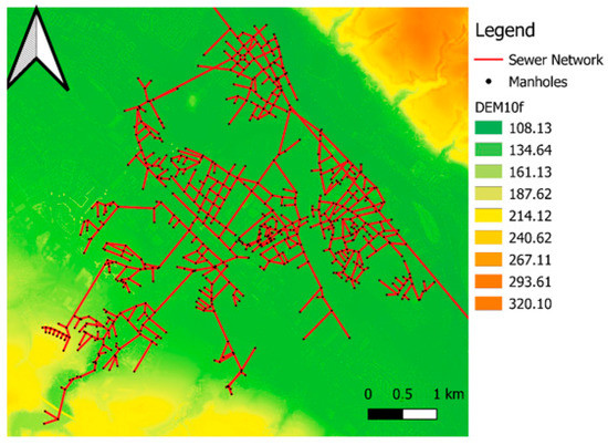 For the present study, a subnetwork of the urban sewer system of Dresden, Germany is used. This network is located in the lower part of the Lockwitzbach subcatchment in the southeast of the city. Figure 1 shows the network, manholes, and a Digital Surface Model (DSM) provided by the State Service for Geoinformation and Geodesy of Saxony [22]. The drainage area equals 24.31 km2, of which 42% is impervious, and it contains 8.4 km of the river before it flows into the Elbe River. The region has a variety of land uses seen in Figure 2, including residential, commercial, industrial, infrastructure, agricultural, different types of green areas, water bodies, and mixed areas [22].