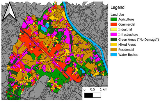 The damage estimation is easy to implement and fast to calculate. Nonetheless, there is much uncertainty applying such broad DDFs to large areas [20,20,32,33]. DDF are assigned by land use, and in the case of this study, is an average for the whole country. LU types that could be further subdivided into classes, or DDF, can be developed for the study. More accurate methodologies could be applied in the same platform, like more region-specific DDFs or even building-specific DDFs. Sometimes in-depth data for the study area are not available. Therefore, as a starting point, the global DDFs used in this study can be used as a starting point to evaluate the consequences of urban floods [19]. Land use or land cover can be obtained from satellite images like Land from the COPERNICUS project [34]. Satellite datasets could be a great starting point to delineate areas of risk in large areas or cities, to select areas of interest for more in-depth studies.