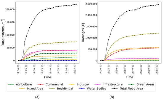 Time series of propagation of flood extents and its impacts for a 50-year return period design storm event. (a) Flood extents in [m2] (b) Damage estimation in [€].