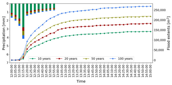 In Figure 4, the total flood propagation of the four return periods can be observed in a graph along with the hyetographs of rain events used for the simulations. As expected, the longer the return period, the more widespread the flood becomes. Additionally, for all return periods, 50% of the flood propagation occurred within the first 30 min, even though some propagation still occurs until the end of the simulation, even a few hours after the rain event finished. This suggests that early action is needed to really decrease the propagation. As previously mentioned, a timely Early Warning System could provide up to a few hours of lead time in an urban environment [29,30].