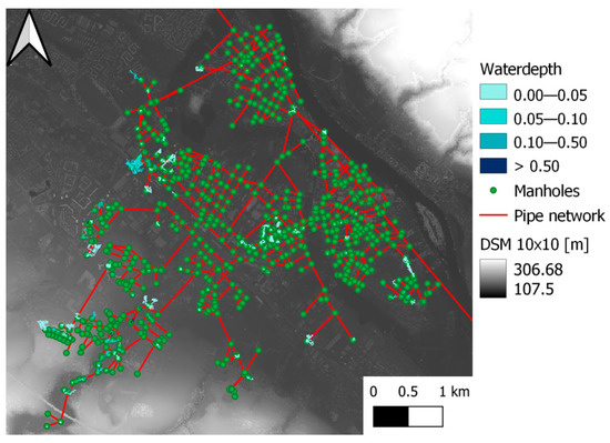 Digital surface model of study area with urban drainage network and manholes of study area in the Lockwitzbach subcatchment.