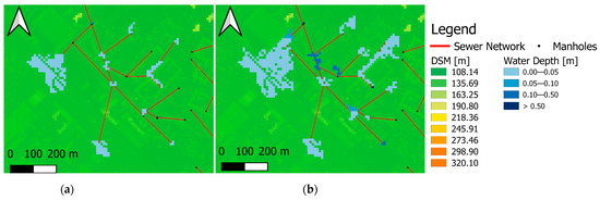 Overland diffusion for a design storm event with a 50-year return period flood in GAMA in study case area. (a) Flood propagation 30 min after the start of rain event; (b) Flood propagation 180 min after the rain event started.