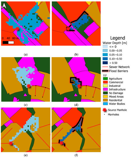 Final flood extents propagation in GAMA for different manholes of a design storm event with 100-year return period. (a) Manhole “17G25” without flood barriers; (b) Manhole “17G25” with flood barriers; (c) Manhole “39K169” without flood barriers; (d) Manhole “39K169” with flood barriers; (e) Manhole “17H120” without flood barriers; (f) Manhole “17H120” with flood barriers.