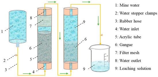 We used a self-developed leaching and filtration experiment to simulate the permeation and migration of mine water in underground rock formations. The leaching unit was divided into three main parts: the leaching, filtration, and testing sections. The filtration section controlled the filtration rate by modifying the height of the tank containing the prepared mine water solution; the mine water flowed from the bottom upwards to ensure that the mine water mixed well with the rock sample, while facilitating the discharge of air from the acrylic tube. The rock sample was placed evenly in the filtration tube and compacted; a nylon mesh was added to the filtration tube to prevent the rock sample from flowing into the rubber tube and blocking the pipeline. The filtration section was mainly used to filter the mine water samples. After the mine water was drained by the rock samples, there were many solid impurities in the water. Thus, first, the length of the water flow path was increased to precipitate a lot of impurities and, simultaneously, a filtering cotton cloth and filter paper were used to filter the water solution. The test section employed a precision pH meter, calcium ion electrode, and total dissolved solids (TDS) meter to monitor the parameters of the dripping solution, and the samples were retained for later testing. The drip filtration experimental setup is shown in Figure 1; the setup includes an acrylic tube with an inner diameter of 4 cm and a height of 30 cm.