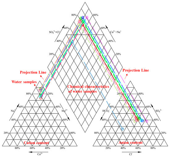 The AquaChem water quality analysis software was used to draw the piper trilinear diagram based on the test results for the ion concentration of the mine water. As shown in Figure 2, the mine water from the Lingxin coal mine was mainly dominated by cations such as Na+, Mg2+, Ca2+, and K+ and anions such as SO42−, Cl−, and HCO3−; the water chemistry type of the water was SO4·HCO3·Cl-Na; the solution was alkaline. According to the environmental quality standards for groundwater, the mine water in the Lingxin coal mine water belonged to class V, indicating that the water quality was poor.