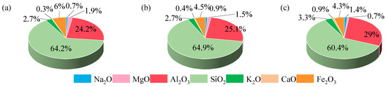 Figure 4 and Figure 5 show the mineral compositions of the three rock samples, MS14, MS15, and MCS16; they mainly comprised quartz, kaolinite, muscovite, and feldspar. Quartz was the predominant mineral component of the three samples, and the kaolinite content of MCS16 was higher than those of MS14 and MS15. MCS16 contained small amounts of calcium-iron sphalerite, serpentine, purple silica-aluminum-magnesite, and silica-calcite. All three rock samples contained more than 50% quartz and more than 20% kaolinite, which is a clay mineral with a laminated structure and a certain degree of water absorption; it can adsorb more ions in mine water and purify mine water resources. Figure 6 shows that the rock samples from the roofs of coal seam Nos. 14, 15, and 16 were all siliceous rocks, with the SiO2 content exceeding 50%, Al2O3 content exceeding 20%, MgO and CaO content combined at approximately 1–2%, and the Fe2O3 content at approximately 4–5%. The presence of more silicate minerals in the rock samples resulted in a higher SiO2 content in them.