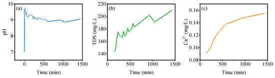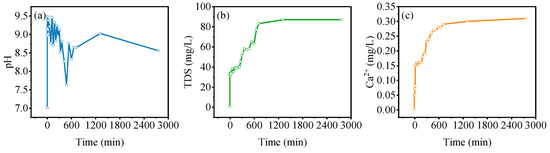 Solution characteristics of the muddy siltstone after leaching with deionized water: (a) pH value; (b) TDS concentration; (c) Ca2+ concentration.