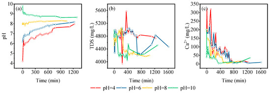 Solution characteristics of muddy siltstone leached by mine water at different pH values: (a) pH value; (b) TDS concentration; (c) Ca2+ concentration.