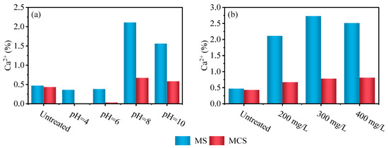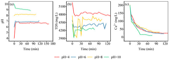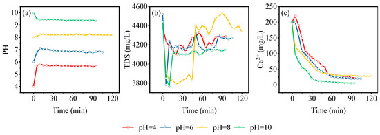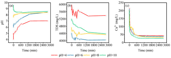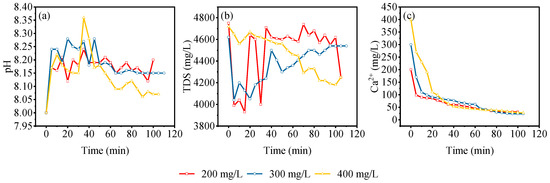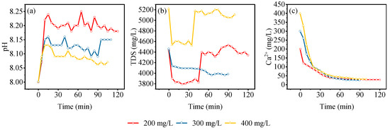 As shown in Figure 15a and Figure 16a, the pH value of the dewatering solution increased rapidly after leaching with different calcium ion concentrations and eventually stabilized. The pH value of the dewatering solution stabilized at 8.2, 8.15, and 8.05 for calcium ion concentrations of 200 mg/L, 300 mg/L, and 400 mg/L, respectively. The calcium ion concentration was inversely proportional to the pH value of the dewatering solution; the higher the calcium ion concentration in the mine water, the higher the pH value of the dewatering solution; the lower the calcium ion concentration in the mine water, the lower the pH value of the dewatering solution.