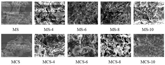 The SEM observation test results show that there were many holes and fissures on the surfaces of the gangues of the MS14, MS15, and MCS16 specimens. The muddy siltstone had longer and pore-like fissures and laminated clay minerals on the surface. These specimens were physically adsorbed owing to the water chemistry of the leaching solution, and the numerous fissures on their surfaces made it easier for them to form fissures under the action of the leaching solution, causing many soluble components to dissolve in the leaching solution. The medium-grained coarse sandstone had many randomly distributed pores that had not been penetrated to form obvious fissures. The surface was relatively poorly leveled, with many small grains.