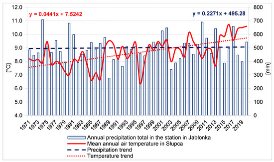 Climatograph illustrating changes in mean annual temperature and precipitation amount in the study area in the period 1971–2020 (based on the data of Institute of Meteorology and Water Management—National Research Institute—IMGW-PIB).