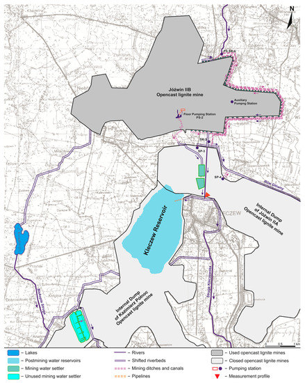 Broad-scale exploitation of lignite has been conducted in the study area since the 1950s. The initial works related to the exploitation of the local Pątnów deposit have shifted from the south-east towards the north-west, initially covering the opencast mine Gosławice neighbouring on Lake Gosławskie. In the following years, several opencast mines were launched and closed, namely Pątnów, Kazimierz Południe, Jóźwin I, Kazimierz Północ, Jóźwin IIAm, and Jóźwin IIB, that still functions today (however, not for longer than until the end of the first quarter of 2023). Such a direction of mining works determined the manner of draining mining waters used by drainage systems developed in earlier years. Mine waters were drained from the beginning of the functioning of the mine towards Lake Gosławskie, through canals, and by means of natural streams from the functioning excavation pits they were redirected to the largest western tributary of Lake Gosławskie, namely Biskupia Struga, and its two tributaries: Struga Kleczewska and Rów Główny (Figure 3). As a result, areas west of the opencast mines that remained within the range of the related depression cone were subject to deep drainage, and catchments on the east and south side were supplied by water from outside their natural alimentation zone. This led to drying in areas to the west, and contributed to the worsening of the possibilities of water supply to former opencast mines.