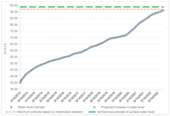 The observation of the current rate of increase in the water level in the post-mining water reservoir Kazimierz Północ shows that the ordinate from the reclamation decision, namely 92.00 m a.s.l., treated as the minimum level of filling the reservoir, will be obtained under normal meteorological conditions in the first quarter of 2023 and not, as originally assumed, by 2030. The ordinate corresponding to the historical level of surface waters in the study area, namely 93.8 m a.s.l. (Figure 9), should be recorded in the reservoir in the third or fourth quarter of 2023. As a result, a water body will soon be developed with a surface area of approximately 530 ha, a volume of 145 Mm3, and a maximum depth of 65.5 m.
