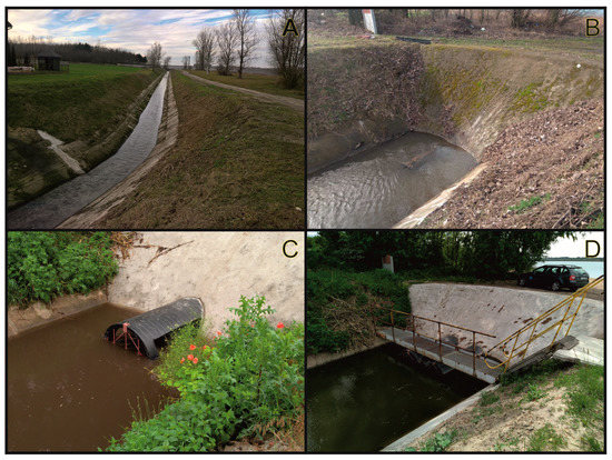 System supplying the post-mining reservoir Kleczew with mine waters from drainage of the opencast mine Jóźwin IIB: (A)—ditch supplying water, (B)—pipe supplying water in the period VII.2016-VI.2020 (Φ = 500 mm), (C)—pipe supplying water in the period VI.2020-XII.2020 (Φ = 1000 mm), (D)—pipes supplying water since XII.2020 (2 × Φ = 1000 mm).