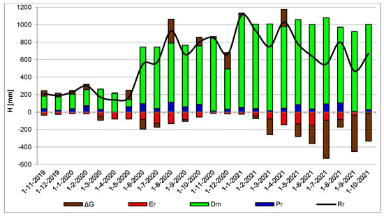 Water balance of the Kleczew reservoir at a monthly scale for the period 2020–2021 (ΔG—resultant of groundwater inflow and outflow, Er—evaporation from reservoir surface, Dm—discharge of mine waters, Pr—precipitation on reservoir surface, Rr—retention of the reservoir).