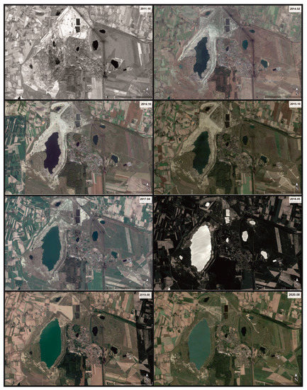 Illustration of changes in the surface area of the Kleczew reservoir emerging in the excavation after the Kazimierz Północ open pit mine in the years 2013–2020 (based on data obtained from GoogleEarthPro).