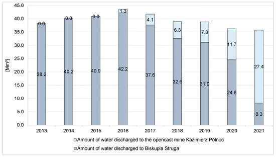 The flooding of the post-mining water reservoir Kazimierz Północ commenced in March 2013 with the switching off of the floor pumping station draining the opencast mine. From then until the end of 2021, the water level in the reservoir increased by 50 m (Figure 4) and its surface area increased to ~407 ha (Figure 7). Over less than nine years, the reservoir was filled by 2/3 of its volume, reaching a volume of approximately 100 Mm3. During this period, the reservoir was supplied with water from the drainage of the opencast mine Jóźwin IIB with a volume of approximately 59 Mm3, primarily in 2020 and 2021 (Figure 8), when the remodelled system of supply of the reservoir already functioned. The measures undertaken in 2020 met the objective of accelerating the flooding of the post-mining water reservoir Kazimierz Północ.