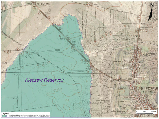 Range of the new post-mining water reservoir Kazimierz Północ in August 2020 on the background of a topographic map from the 1980s showing the historic ordinate of the surface water level (source: https://mapy.geoportal.gov.pl/imap/Imgp_2.html?gpmap=gp0, accessed on 20 July 2022).