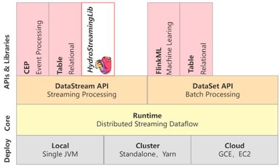 Data-processing based on Flink is mainly divided into three parts: data import (Source), algorithm component (Operator) and data export (Sink) []. HydroStreamingLib is an algorithmic component, and it supports a variety of data sources and data export forms. The location of HydroStreamingLib in Flink is shown in Figure 1. An example implementation of the system platform will be discussed in Section 4.