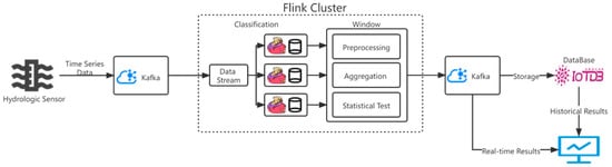 Considering that most hydrologic practitioners are not familiar with big-data frameworks, it may be difficult for them to construct an integrated distributed real-time analysis system. Therefore, in this paper we provide an all-in-one solution for hydrologic practitioners who have no experience with big-data frameworks. Based on HydroStreamingLib, we perform a hydrologic real-time statistical analysis system from data acquisition to visual display. The basic process of the system is shown in Figure 2. Hydrologic data are collected by hydrologic sensors in rivers, and the hydrologic time-series data are transmitted to the Flink cluster for processing through the message queue Kafka. Flink receives and analyzes the data of different topics. In the Flink cluster, the data flow of each station is divided into sub-streams according to the station’s identity. Meanwhile, the hydrologic time-series data of different sub-streams are aggregated according to the four time dimensions of hour, day, week and month. HydroStreamingLib is called to calculate the statistical value and identify the properties of the data in each time window. Finally, the test results are inputted into the message queue Kafka, and the test results of the real-time data displayed by the platform are verified. At the same time, the data are stored in the time-series database IoTDB for historical data querying. The system runs on a distributed cluster, and Flink allows work for a given computation, insert, or query to be divided into smaller sub-tasks that can be run concurrently on different nodes to reduce the overall processing time and improve the performance of the solution [].