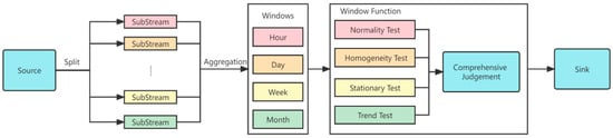 The Flink data source, as the consumer of Kafka, reads the stream data from Kafka. After obtaining the data, it divides the data according to the identity of the hydrologic station and calls the calculation and discrimination module in HydroStreamingLib to calculate the statistical test results and judge the characteristic. One of the basic calculation discrimination modules is shown in Figure 4. Finally, the calculated results are put into the message queue as Kafka’s producer for subsequent data storage and real-time display.